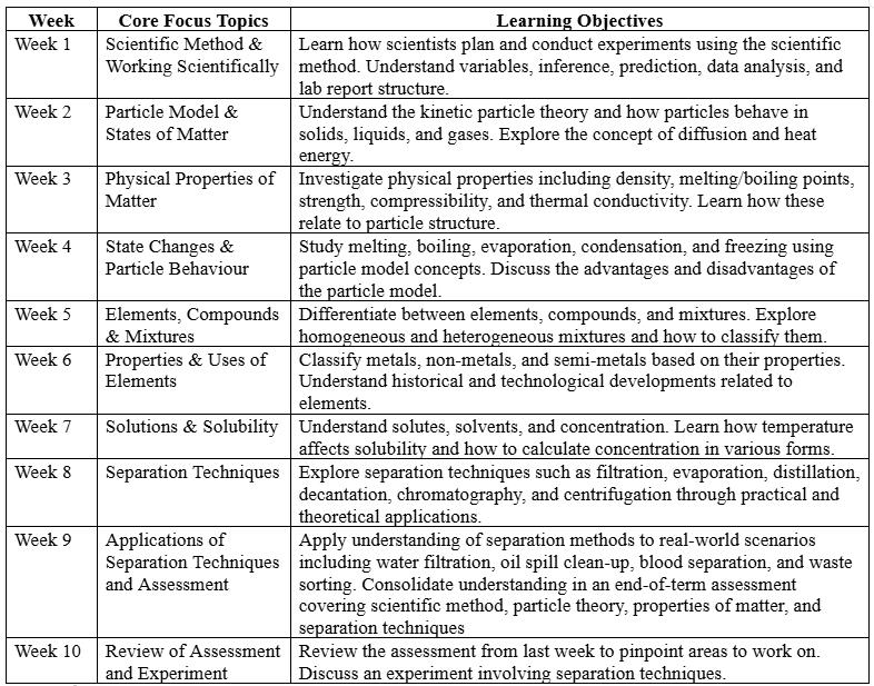 This is an immersive science course designed to ignite curiosity and deepen understanding in the diverse realms of biology, chemistry, physics, and Earth sciences. It is designed to be accelerated ahead of the school syllabus so students can be more confident in class when covering topics for the second time. Through hands-on experiments, inquiry-based learning, and collaborative projects, students will explore the wonders of the natural world, developing critical thinking skills and a foundation for advanced scientific studies. Weekly homework questions allow students to consolidate knowledge learned during the lesson, and end of term assessments allow students to apply their understanding covering topics in that term. This course assists in building an essential foundation for senior sciences that will allow students to grasp complex concepts in the future.